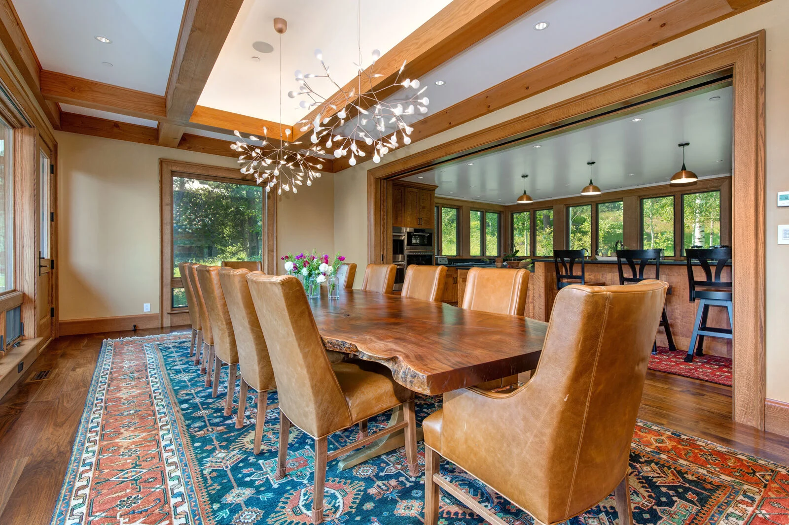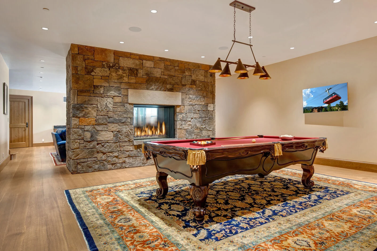 Bedding: 1 King, 1 King, 1 King, 2 Captains Bunk (twin over queen), 2 Twins (king conversion for a fee) Approximately 4,145 square feet Contact free, Remote Check-In • Three sided fireplace • Indoor hot tub • Washer and dryer • Boot dryer Moose Hideaway brings the beauty of the outdoors inside; the gracious layout finds serene details echoing the natural splendor surrounding the five-bedroom home. There are three master bedrooms with en-suite bathrooms to make this an easy destination for families to gather. There are also two living areas upstairs and downstairs that leads to a adult and kid zone very easily. The house has the latest technology with access to 5G network throughout as well as Apple TV, Google mini's and full choice of cable programming on each TV in every bedroom. Moose Hideway envelopes guests long before they step foot inside: The spacious entry porch presents a bench respite, and rustic barn wood flanks the entrance. The foyer, marked by flagstone, flows into the open-floor plan perched amid the fir trees. A floor to ceiling window greets you as you enter. The first bedroom to the left of the front door, a retreat outfitted with a king sized bed, flat-screen TV, wood-paneling and bath with a large tiled shower. Continue on to the second master suite with its glimpse of valley views, framed by the forest. A plush duvet covers the king bed, backed by a leather-paneled headboard piled with beautiful accent pillows. The suite encompasses a walk-in closet and large master bath with custom cabinets, a sink, tile shower and bench. Across the foyer, the living room blends contemporary aesthetics with Western warmth: rustic, barn-wood paneling lines the walls and exposed beams fly above. A pair of textured sofas dialogue with two leather armchairs around matching stone-topped tables a cowhide rug in the primary seating area. Nearby, an iconic chaise with a leather sofa provides a retreat to read a book or have a separate conversation between the fireplace and a lamp-lit console for quiet contemplation of a cowboy lithograph. The three-sided fireplace warms both the living room and the adjoining dining room, where a stone-inlayed dining table comfortably seats eight to ten beneath a chandelier of votives. The neighboring gourmet kitchen boats a built-in charcoal grill, granite counter-tops, custom cabinetry, a double-basin porcelain sink, and a stove island. A breakfast area offers banquette seating for four as well as three chairs, and a built-in desk lends convenience with a charging station for phones and a bluetooth speaker to share your favorite music anywhere in the house. The kitchen overflows onto the deck, where a Weber gas grill, a dining table and eight chairs encourage outdoor entertaining. Just off the kitchen is a laundry room with large capacity washer and dryer. The mudroom with dual entrances from the two-car garage and front porch. Its cubbies, a ski rack and coat hooks and commercial boot dryer make winter disrobing easy. A powder room and hall closet round out the main-level amenities. Art enlivens every room. Downstairs offers even more living areas, with a second family room with a large floor to ceiling window overlooking the forest that features a game table for four, armchairs, two large couches, a 55'" flat-screen TV and entertainment system, including Blue-ray player for access to guests' internet accounts. An indoor hot tub feels outdoors with its surrounding walls of windows but is easy to access off the family room. This bonus living space is complete with an additional 3/4 bath. Lower level sleeping quarters look out onto the forest and include 3 bedrooms. The first downstairs bedroom, just to the right of the stairs, presents two twins topped by woolen bedspreads and backed by wrought-iron headboards. A second bedroom features two sets of built-in captain bunks. A detached bath caters to both bedrooms with its tile shower and tub and double vanity. Across the living area from the west wing is the third master bedroom, which boasts a king bed with its wood headboard, duvet and leather-covered bench anchoring the bed's foot. A matching console and upholstered armchair accent the room, and the walk-in closet leads to the bathroom with its marble counter-top and tile shower and tub. All told, the Moose Hideaway pairs serene elegance with nature immersion. \*Please note, gatherings greater than the maximum occupancy are not permitted in this property. Mountain weather is variable and unpredictable. Resort conditions and ski access may be weather and snow dependent.